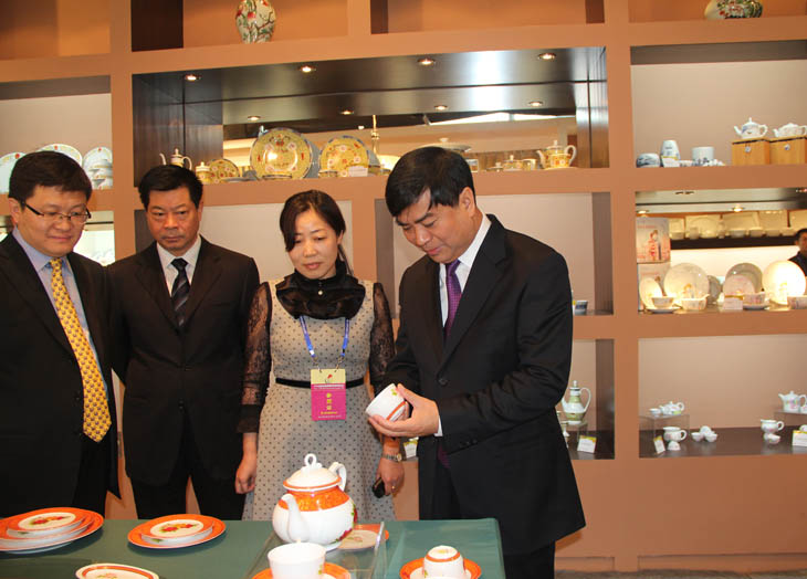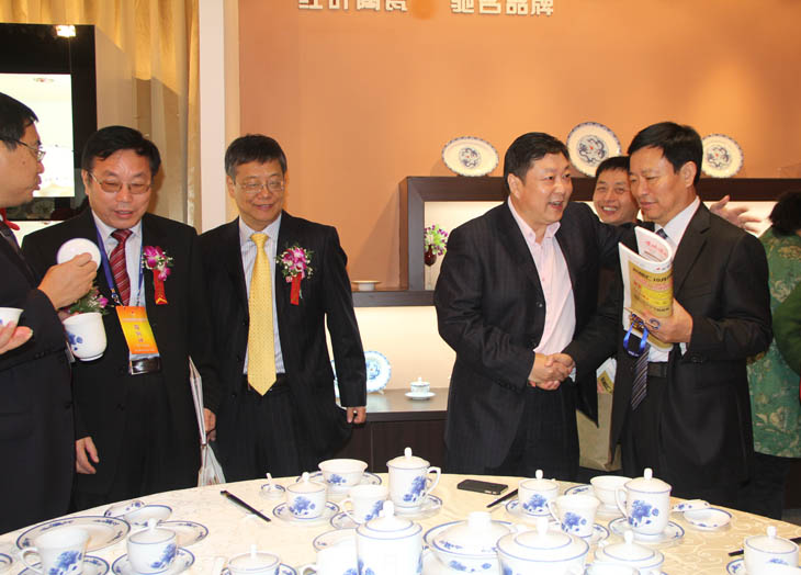 全國人大常委會(huì )副委員長(cháng)韓啟德在我公司展館參觀(guān),對我公司在全國青花玲瓏及青花日用陶瓷器形與裝飾設計大賽金獎作品《憶漢》非常感興趣