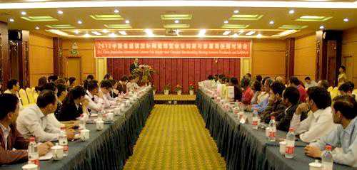 10月18日下午,由瓷博會(huì )、省陶瓷公司主辦的“2012年中國景德鎮國際陶瓷博覽會(huì )采購商與參展企業(yè)對接會(huì )”在開(kāi)門(mén)子三樓會(huì )議室舉行。來(lái)自10余個(gè)國家的40家采購商以及由瓷博會(huì )根據采購需求挑選出來(lái)的55家參展商參加了此次對接會(huì )議。副市長(cháng)張春萍出席會(huì )議并致辭。
