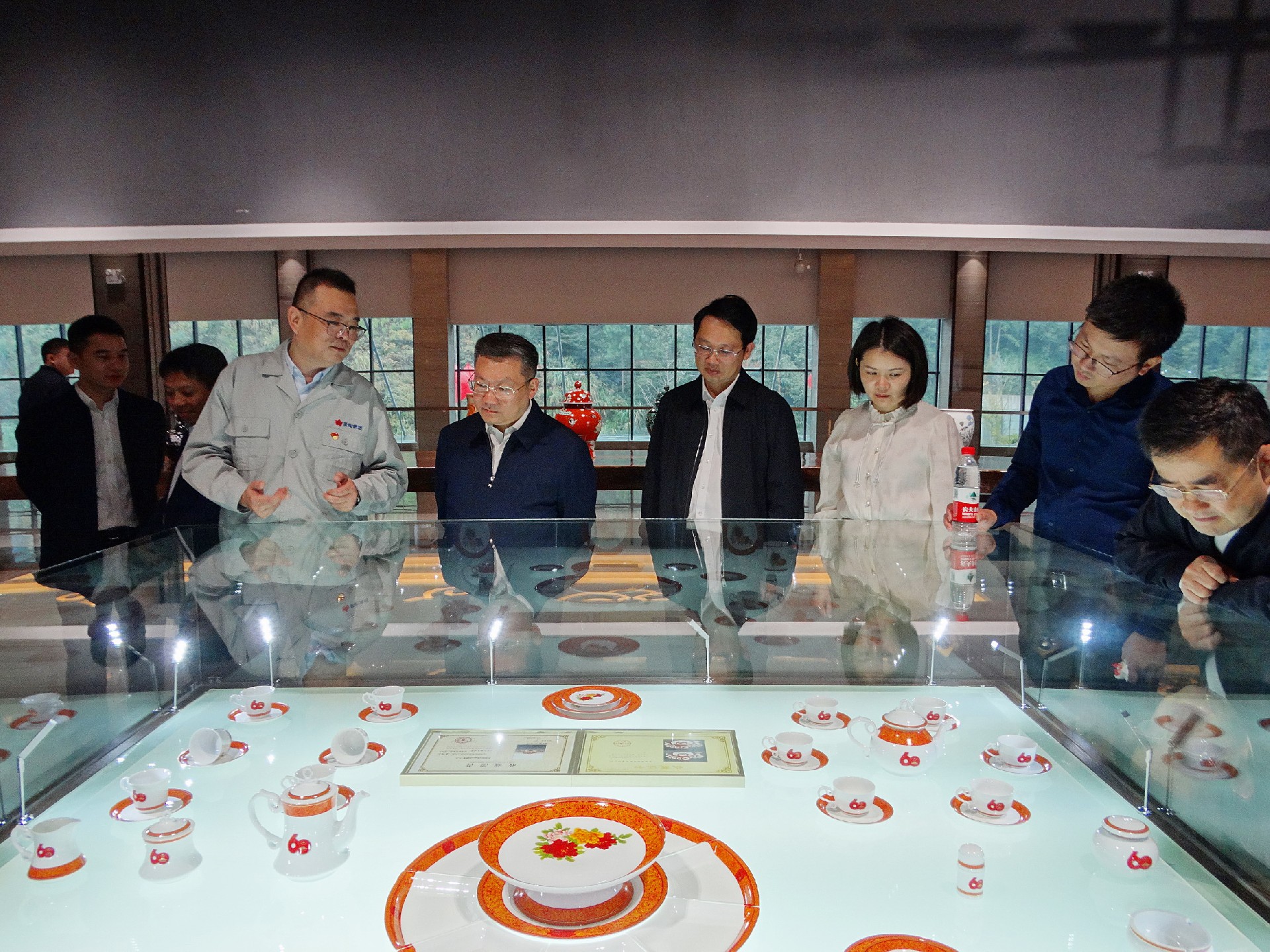 在國瓷館,胡軼向陳澎一行講解國瓷館內的基本情況和產(chǎn)品特色。大家一路走一路看一路聽(tīng),胡軼向重點(diǎn)介紹了“新中國成立60周年國慶慶典天安門(mén)觀(guān)禮臺專(zhuān)用瓷”、“‘瀛臺夜話(huà)’接待外國元首用瓷”、“古典園林”、“首長(cháng)專(zhuān)列用瓷”等。一個(gè)個(gè)國瓷故事和工藝細節,引得眾人贊嘆不已。陳澎還仔細詢(xún)問(wèn)了企業(yè)生產(chǎn)經(jīng)營(yíng)、對外貿易等情況。