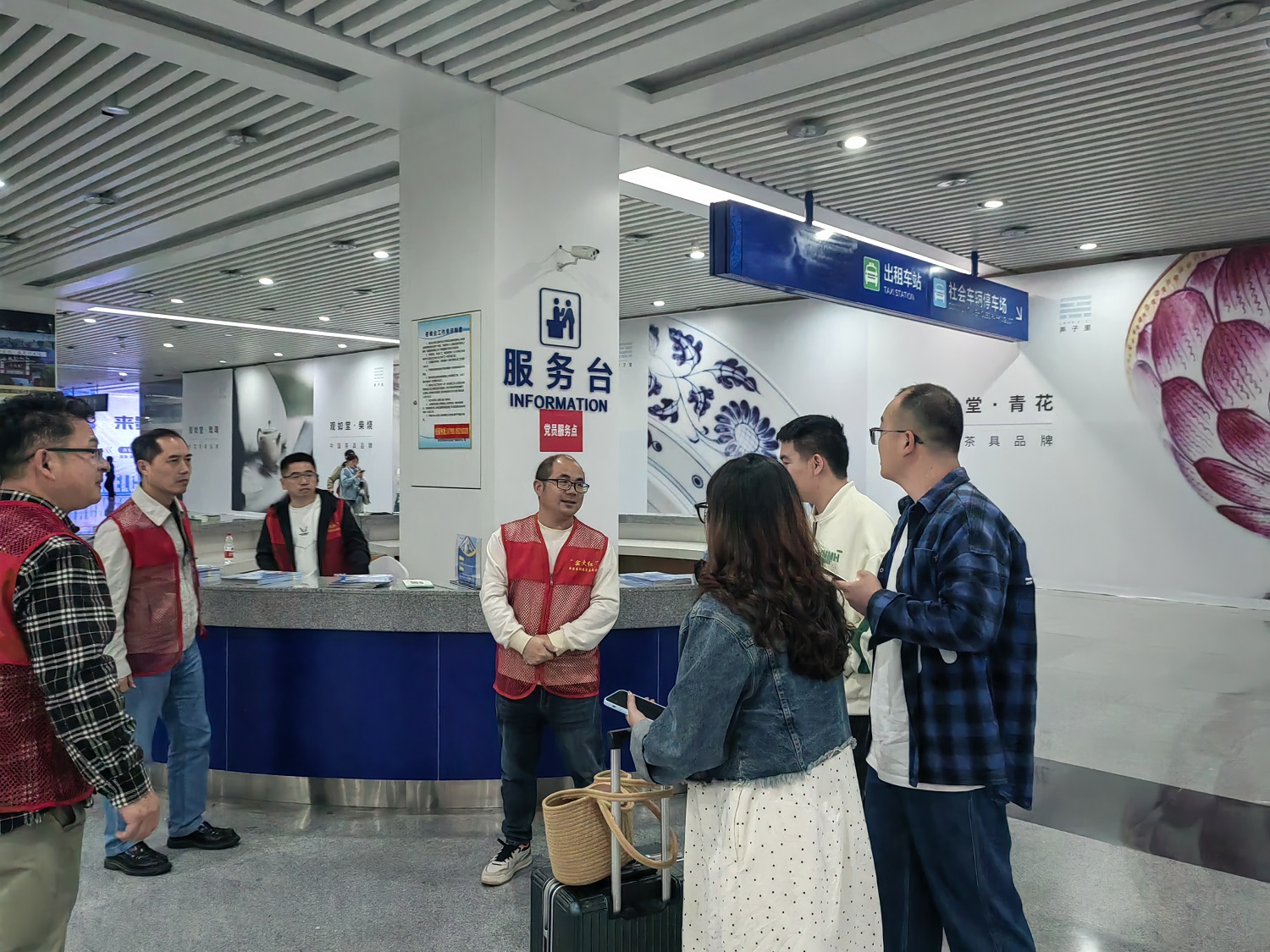 4月30日,五一假期前夕,景陶集團組織70多名黨員志愿者參加市“窯火紅”黨員志愿服務(wù)活動(dòng)。他們身穿紅馬甲,忙碌穿梭在景德鎮北站南廣場(chǎng),北廣場(chǎng)和羅家飛機場(chǎng)的旅客中,為來(lái)景游客指引路線(xiàn),提行李,推介美食美景美宿,引導車(chē)輛有序停放等,送上熱忱暖心的服務(wù),流動(dòng)的紅馬甲成為一道靚麗的“風(fēng)景線(xiàn)"。